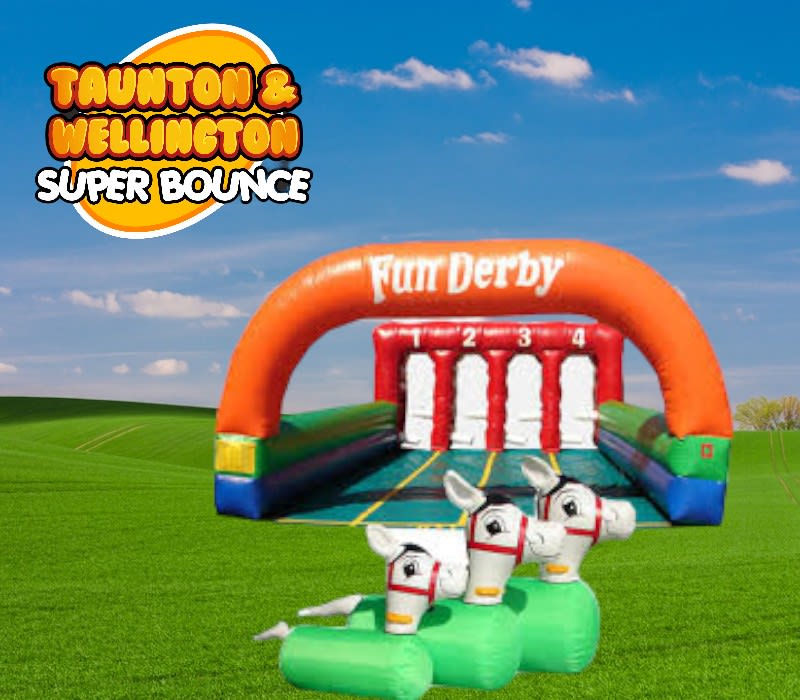 Our inflatable horse racing game is available for hire in Taunton, Wellington, Bridgwater, Burnham on Sea, Minehead, and the surrounding areas. Whether you're organizing a birthday party, a school fair, or a company team-building event, our Derby Horse Hopper Racing game is guaranteed to be a hit!