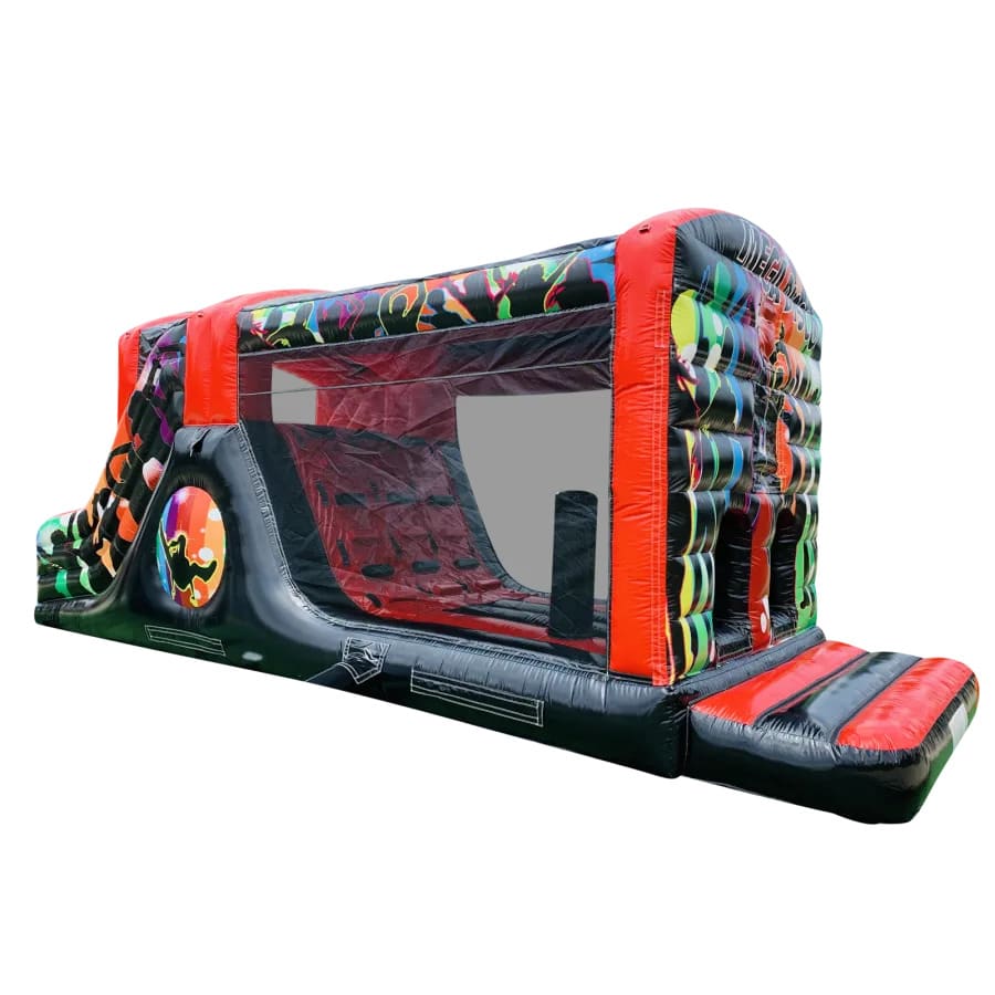 Make your child's day with this modern obstacle section. The inflatable obstacle course offers a safe entrance way with full theming, followed by a series of biff and bash pillars, cool chill out area in the middle, steep ladder climb and a crazy slide out of the end. The obstacle course is the perfect choice for your little one's birthday party school gala, summer fete or just your back garden.