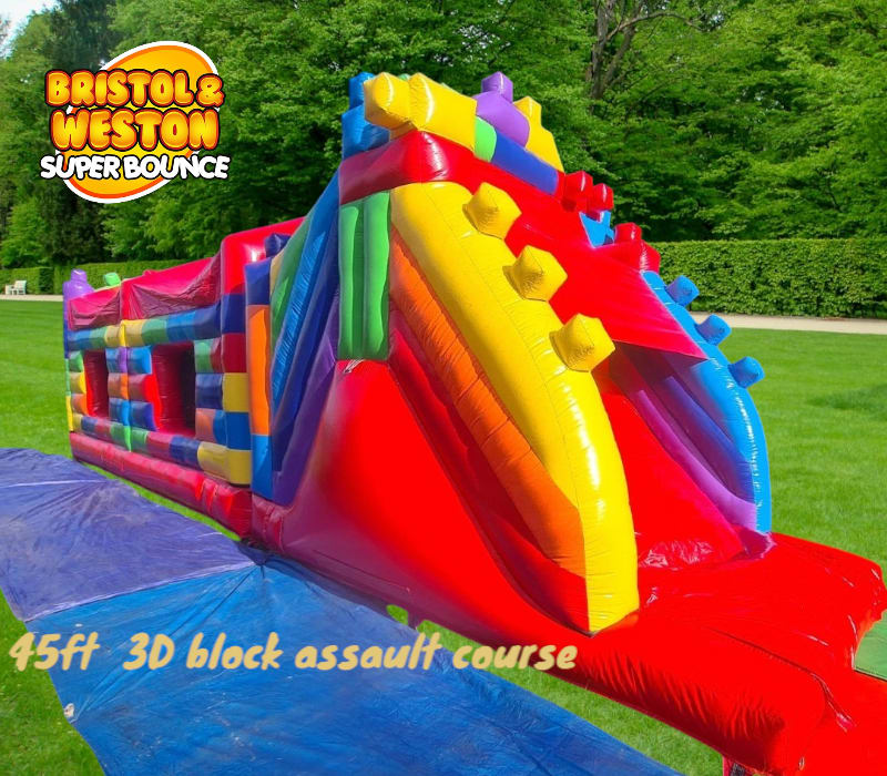 Are you planning an exciting event in Wellington, Taunton, Bridgwater, Burnham on Sea, Weston Super Mare, Clevedon, Nailsea, Portishead, Bristol, Bath, Gloucester, Newport, or nearby areas? Look no further! Our bouncy castle and inflatable hire with the 45ft 3D block Assault Course is the perfect choice for adding a splash of thrill and excitement to any occasion. 🏅