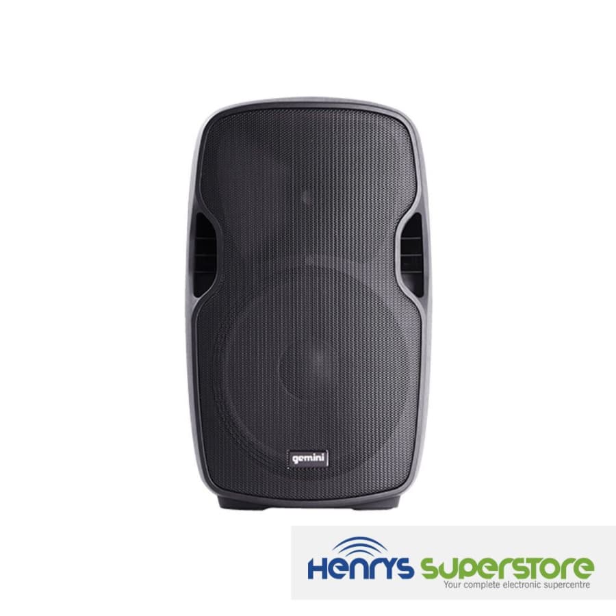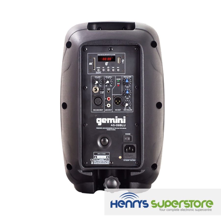 Gemini’s AS-08BLU is a 2-way active PA speaker with 500W peak Class AB built-in power amplifier. It has an 8-inch woofer, a 1-inch voice coil, and a Piezo compression driver, delivering a linear frequency response between 50Hz-19kHz. There are two mic inputs – both line and XLR – 1/4-inch input, 1/8-inch, and RCA input, along with a LED clip alert light. Each input channel also has its own EQ settings.