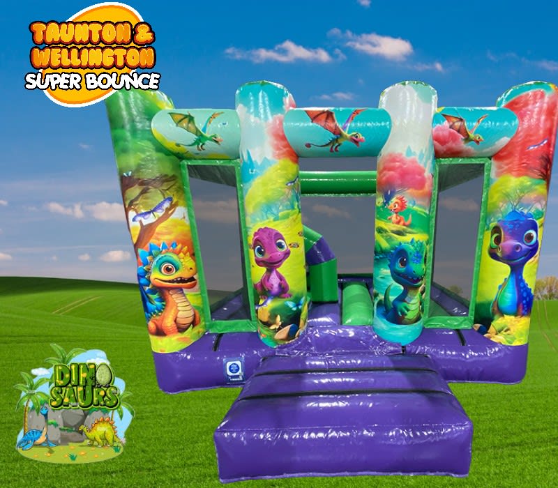 bouncy castle hire Dinosaur midi bouncer 13.1ftx12.8ftx8.2ft (LWH) in Wellington ,Taunton ,Bridgwater , Weston super mare ,Clevedon ,Nailsea ,Portishead ,Bristol ,Bath ,Gloucester ,Newport and surrounding areas. 🚚