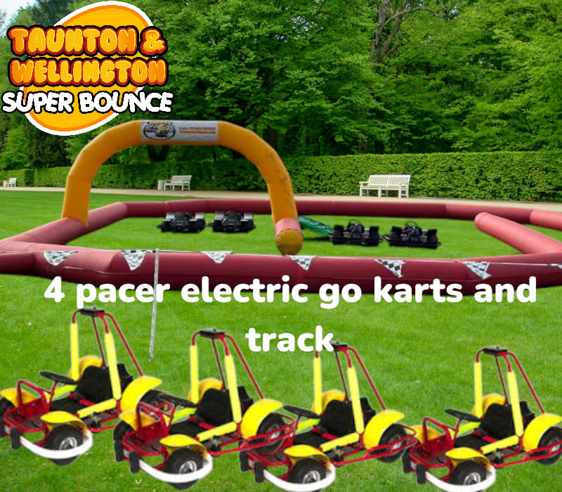 go kart hire 2 hours 4 x pacer go karts with track in Wellington, Taunton, Weston super mare, Clevedon, Portishead, Bristol, Bath and south west — Perfect for Go kart parties and events. Let kids aged 4–10 drive electric Pacer go karts on a cushioned inflatable track. Short setup. Big smiles. Safe speeds. Great for birthdays and community events.